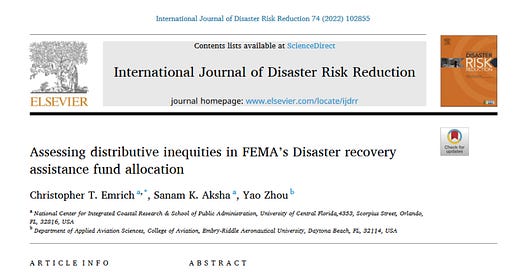 Reference: Emrich, Christopher T., Sanam K. Aksha and Yao Zhou (2022). Assessing distributive inequities in FEMA’s disaster recovery assistance fund allocation. International Journal of Disaster Risk Reduction 74. Full-text is available here.